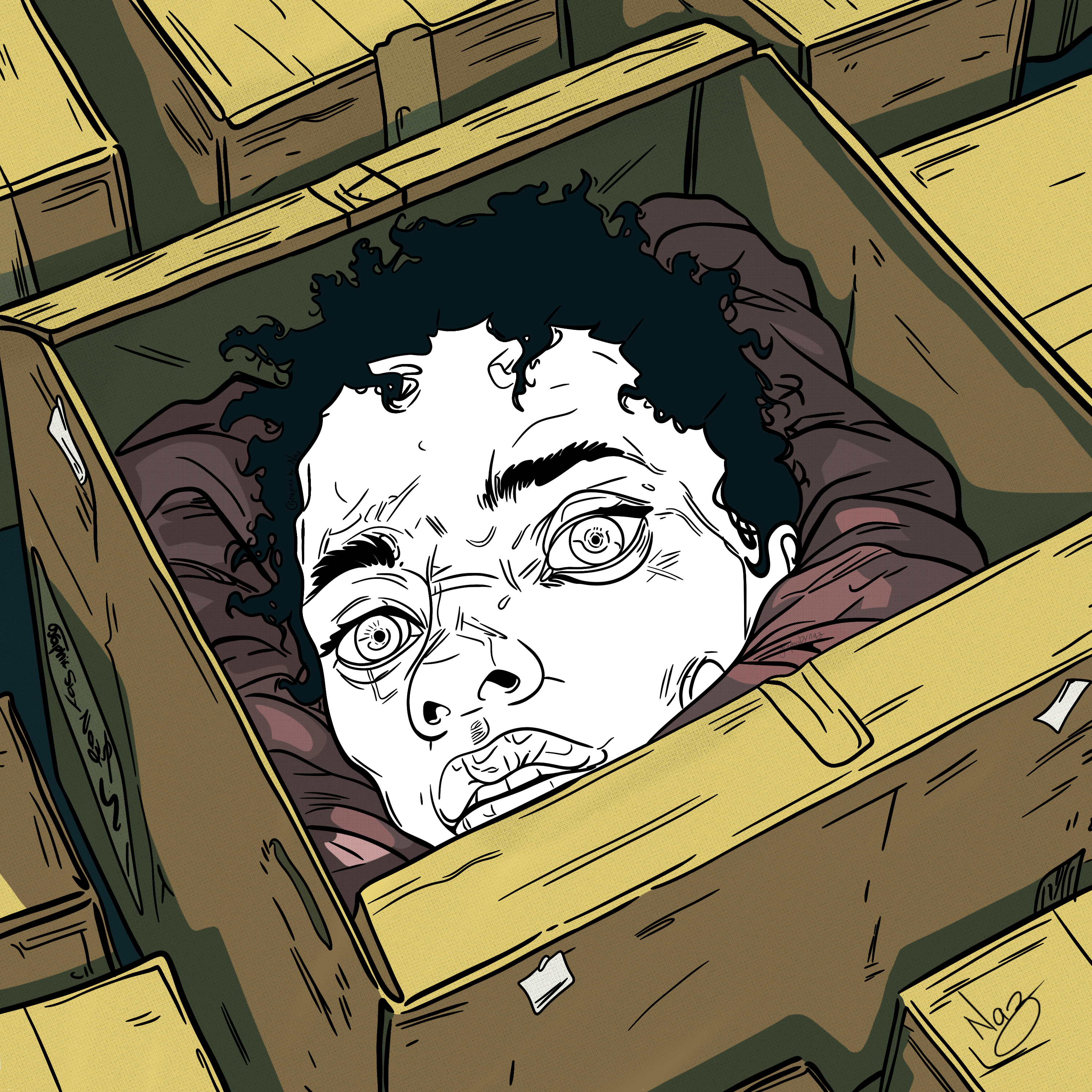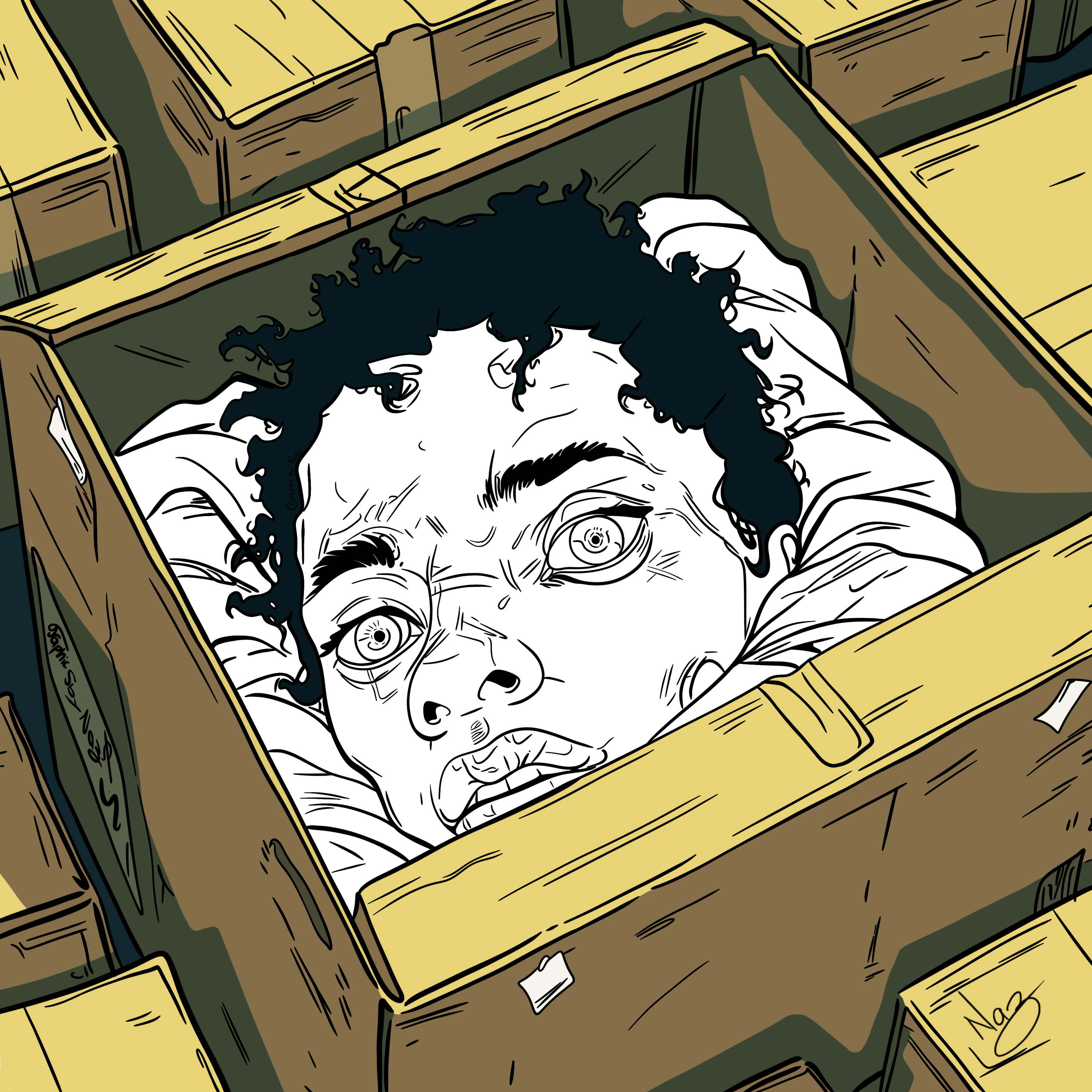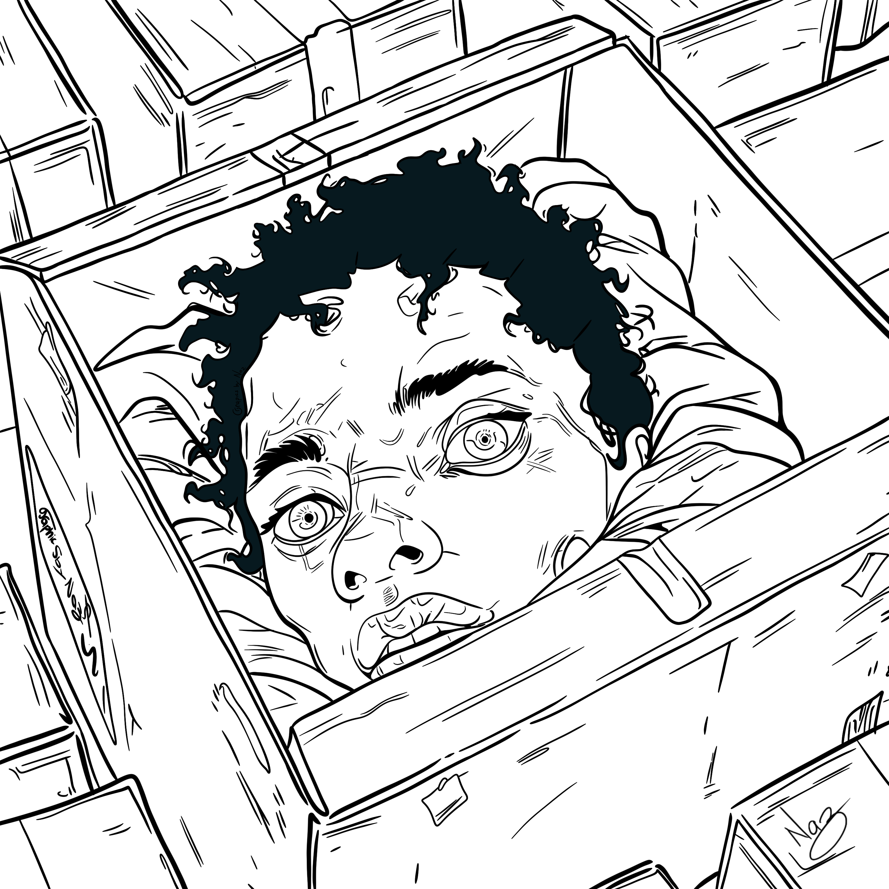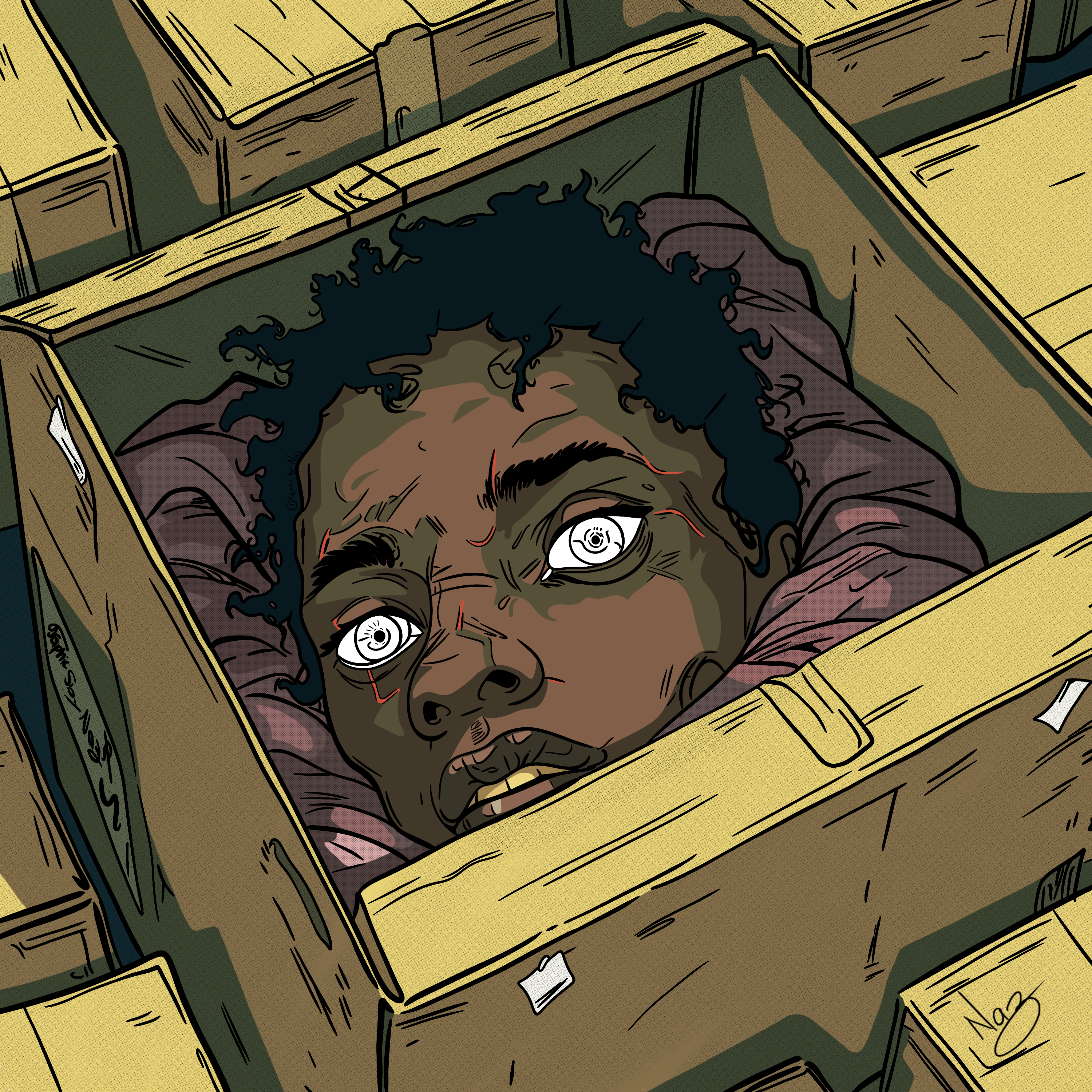 The close-up framing forces an intense, direct connection with the central figure’s golden eyes, symbolizing the internal brilliance and visionary spirit. The intricate, web-like patterns surrounding the figure represent the “captivity” or the complex layers of restriction that shape their reality. The use of a contrasting color palette—rich golds against deep, shadowed tones—reinforces the theme of light within darkness. The character’s expression of quiet strength and wisdom conveys the resilience of the spirit even when confined. The sharp, detailed linework adds emotional weight and realism, highlighting the depth and gravity of their experience.