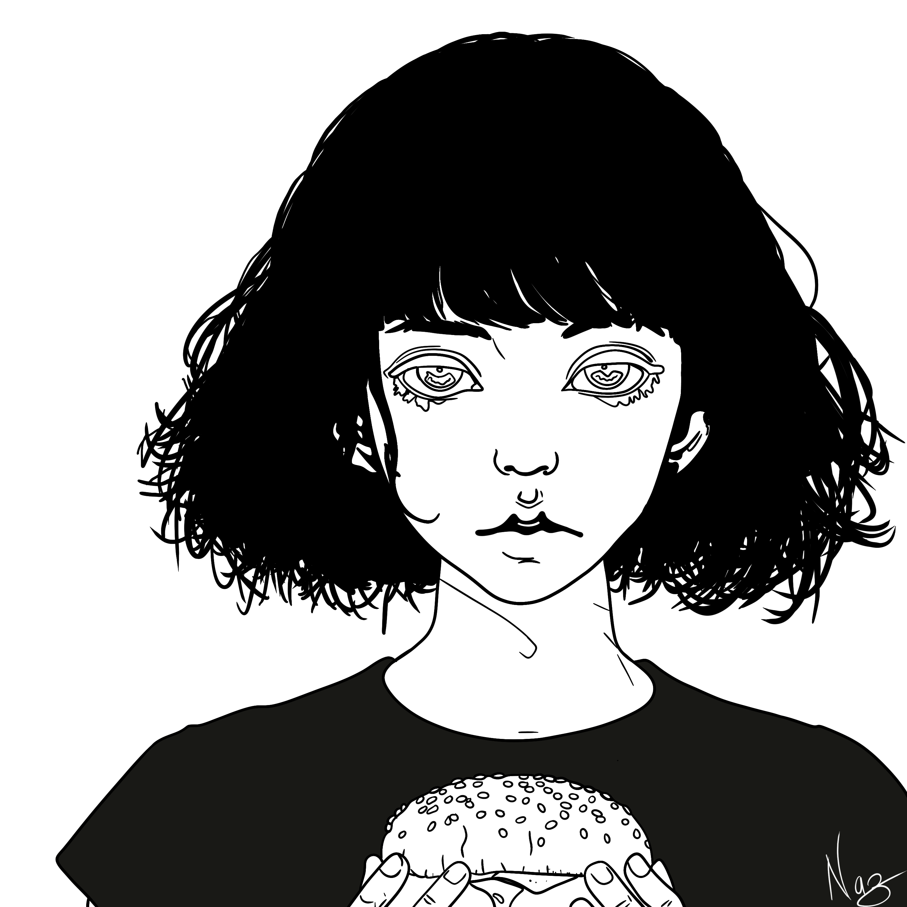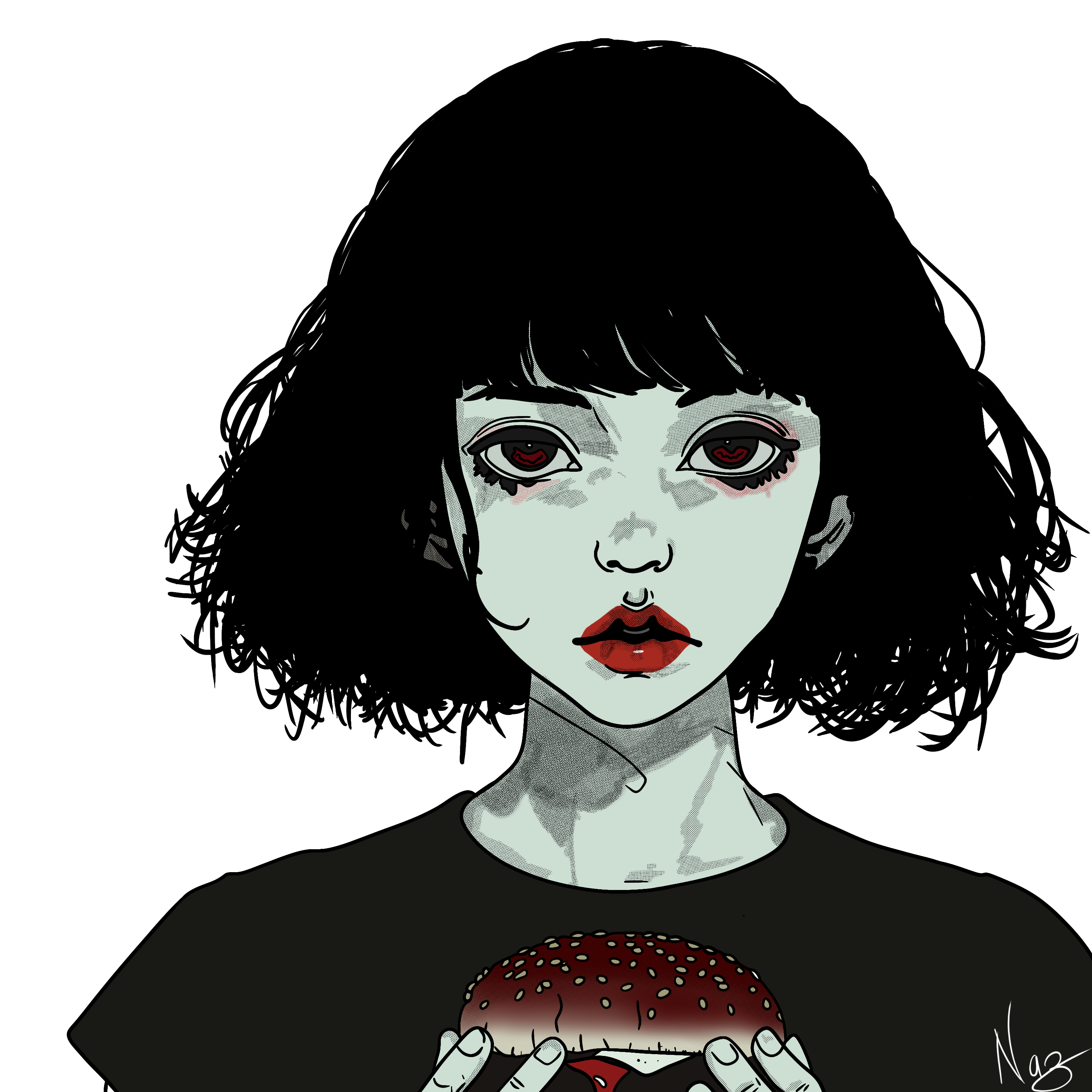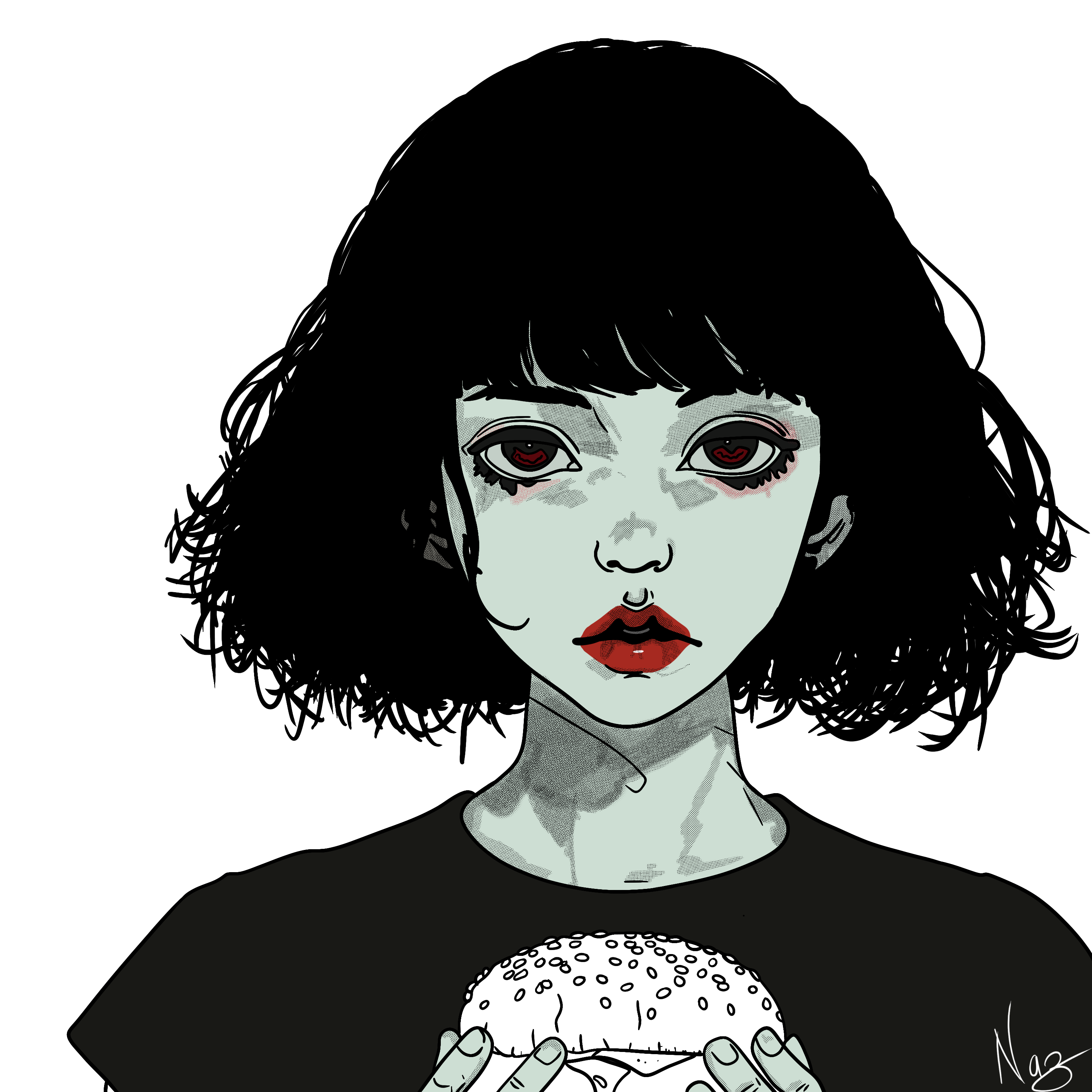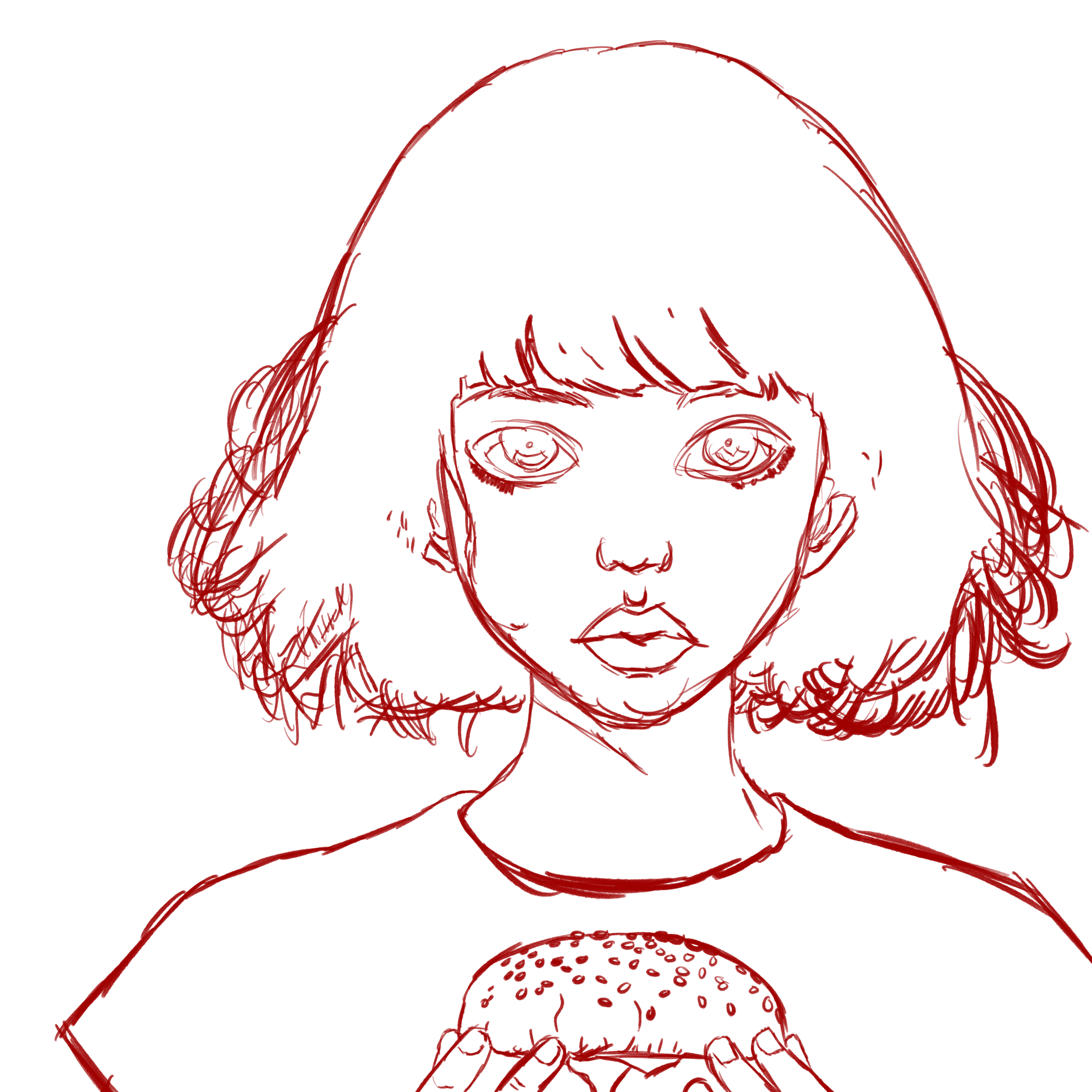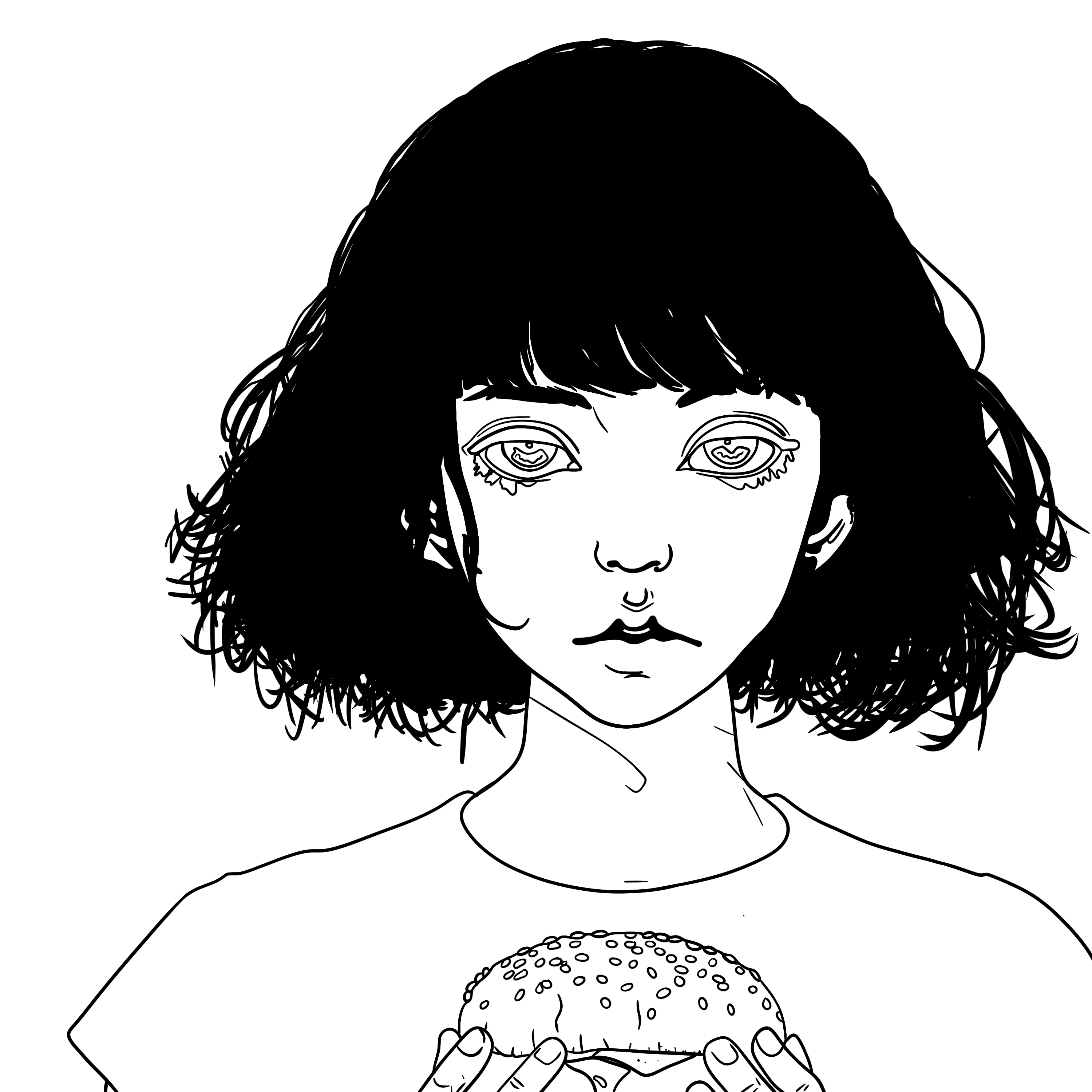 The close-up framing creates an intimate and direct connection with the viewer, emphasizing the raw emotion in the character’s expression. The wide, intense eyes and the subtle, expressive features convey a mix of longing, focus, and quiet desperation. The use of deep, evocative colors and sharp contrasts enhances the emotional weight of the piece, symbolizing the intensity of the internal battle. The minimalistic background keeps the focus entirely on the character’s internal experience, ensuring that every detail adds to the depth and gravity of their “silent craving.” The intricate linework on the face and hair adds a sense of realism and emotional depth.